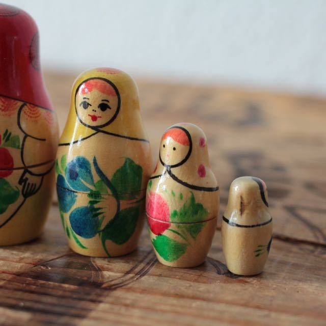 ロシア製のマトリョーシカです。 閉めてペイントされているはずなのですが、きちんと閉まりにくいです。 湿気などの関係かもしれません。 サイズ ・大きい子高さ 約 14.5cm ・小さい子 高さ 約 2.5cm 重さ ・約 150g ※古いものならではの持ち味をご理解下さった上で、aboutの注意事項をお読みになり、購入をお願いします。