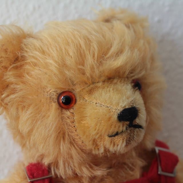 ヴィンテージ又はアンティークのテディベアです。 グラスアイ 口の周り、頭の毛が薄いです。 手足のパッドに穴があります。 サイズ ・体長 約 35cm ・座り時 約 25cm 重さ ・ 約 405g ※古いものならではの持ち味をご理解下さった上で、aboutの注意事項をお読みになり、購入をお願いします。