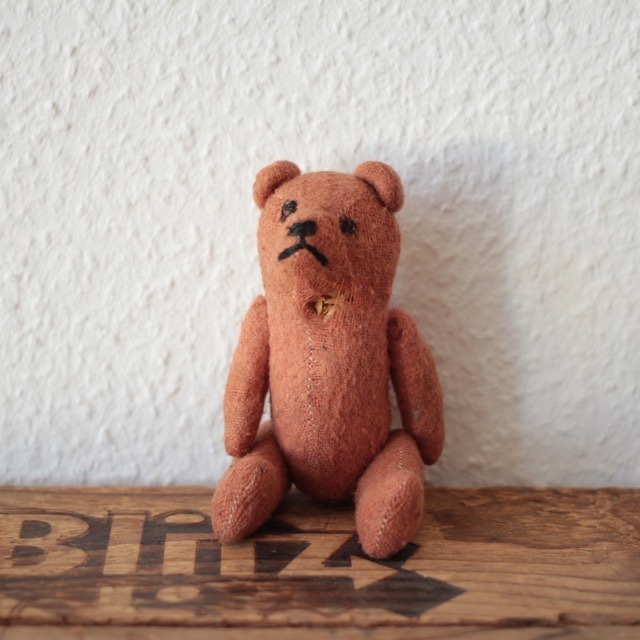ヴィンテージ又はアンティークのテディベアです。 左目の辺りの生地が薄く、首には穴があいています。 手足はそれぞれ連動して動きます。 左足にはボタンが付けられています。 煉瓦色のような、珍しい色のベアです。 サイズ ・体長 約 12cm ・座り時 約 9cm 重さ ・ 約 15g ※古いものならではの持ち味をご理解下さった上で、aboutの注意事項をお読みになり、購入をお願いします。