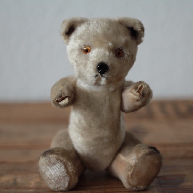 ヴィンテージ又はアンティークのテディベアです。 グラスアイ(目も鼻もガラス製) 手足はそれぞれ連動して動きます。 中は木、もしくは固められたおがくずのようです。 手の先は少しめくれてしまっています。 サイズ ・体長 約 14cm ・座り時 約 11cm 重さ ・ 約 40g ※古いものならではの持ち味をご理解下さった上で、aboutの注意事項をお読みになり、購入をお願いします。