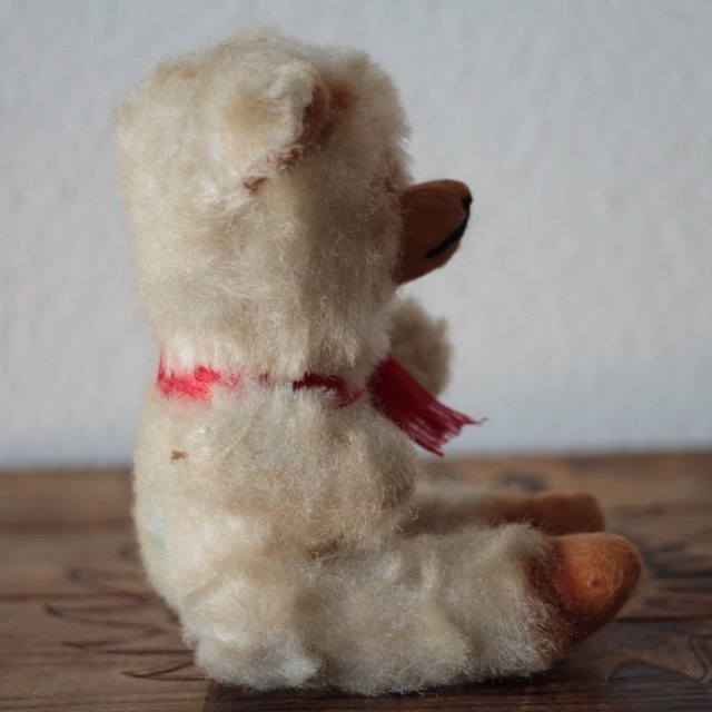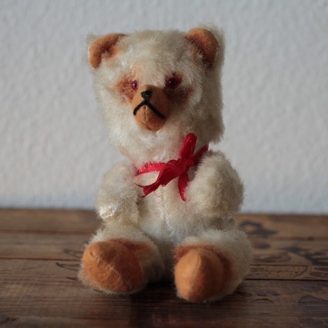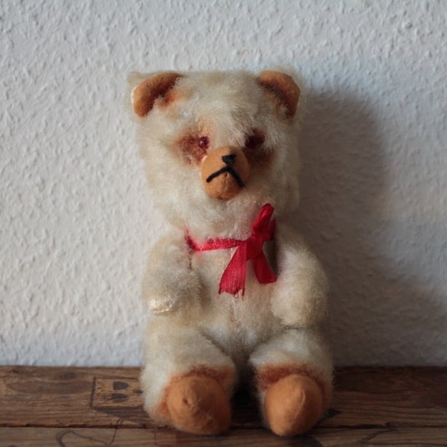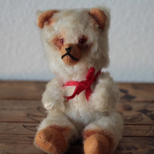 ヴィンテージ又はアンティークのテディベアです。 手足はそれぞれ連動して動きます。 目の周りなどは茶色く、赤目の珍しいベアです。 左右で腕の長さが違います。 サイズ ・体長 約 22cm ・座り時 約 16cm 重さ ・ 約 70g ※古いものならではの持ち味をご理解下さった上で、aboutの注意事項をお読みになり、購入をお願いします。