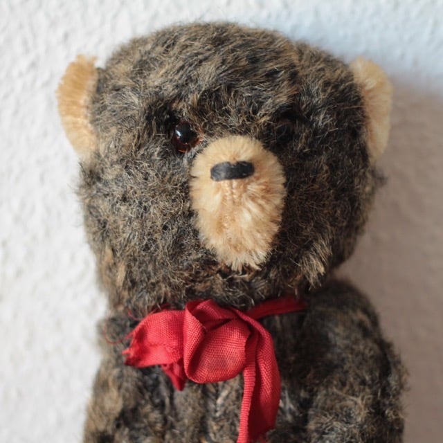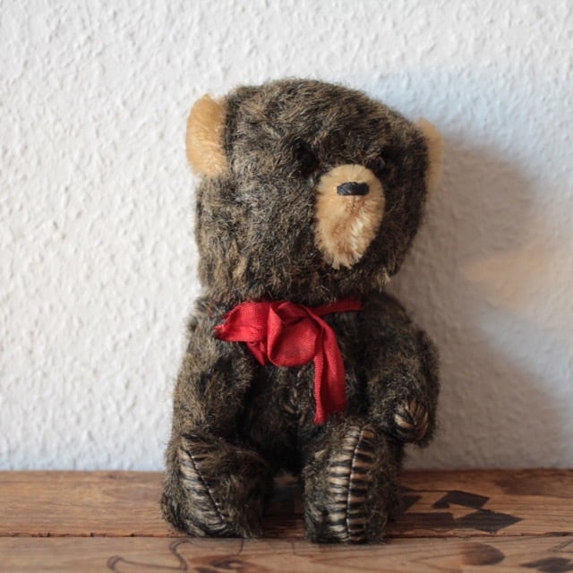 ヴィンテージ又はアンティークのテディベアです。 グラスアイ 手足はそれぞれ連動して動きます。 手足の先、頭のてっぺんに、お腹の縫い目には、毛が入り込んだままになっていて、シマシマに見える箇所が多々あります。 サイズ ・体長 約 21cm ・座り時 約 16cm 重さ ・ 約 105g ※古いものならではの持ち味をご理解下さった上で、aboutの注意事項をお読みになり、購入をお願いします。