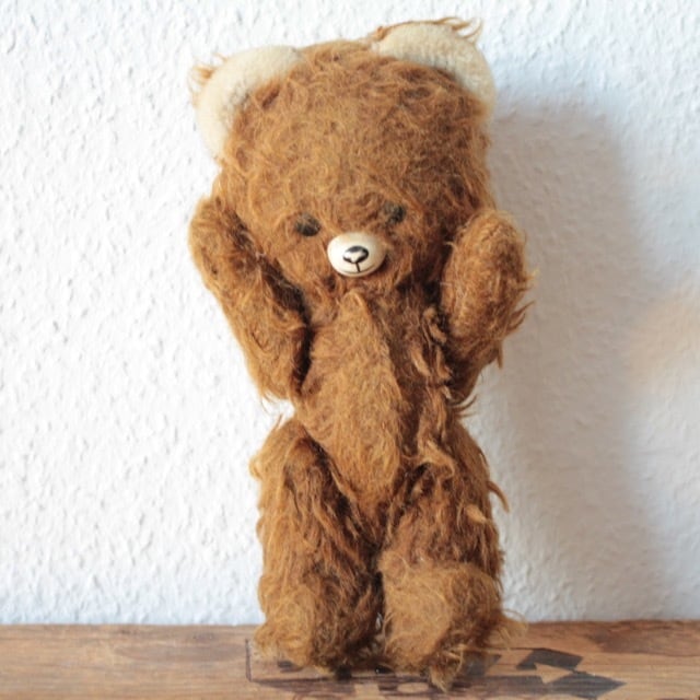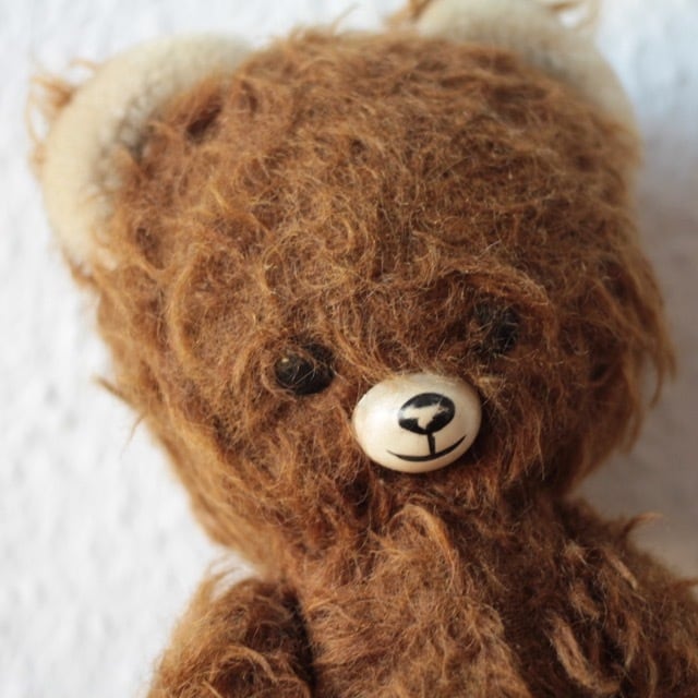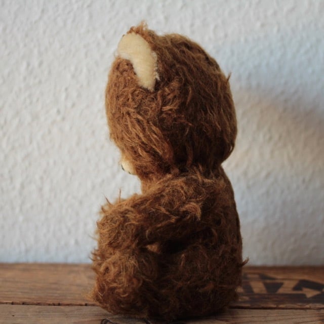 ヴィンテージ又はアンティークのテディベアです。 首のジョイントはありませんが、 手足は連動していません。右腕の留め具が見えます。 鼻のてっぺんのペイントが擦れていて 、 胸、背中、後頭部にモヘアロスがあります。 サイズ ・体長 約 21cm ・座り時 約 17cm 重さ ・ 約 100g ※古いものならではの持ち味をご理解下さった上で、aboutの注意事項をお読みになり、購入をお願いします。