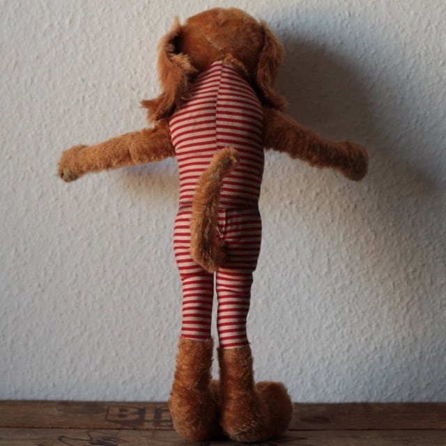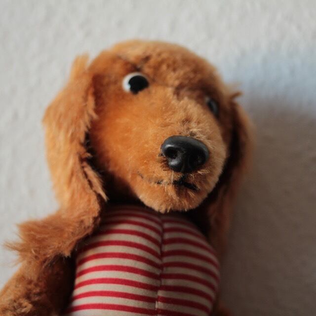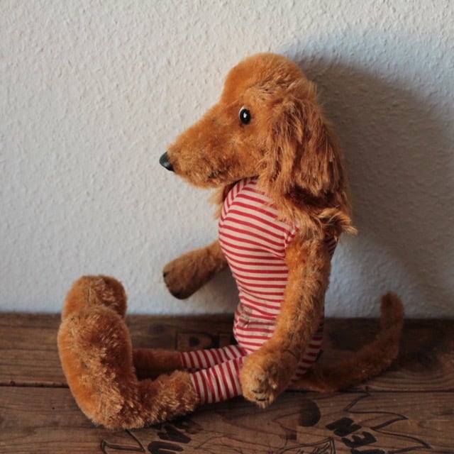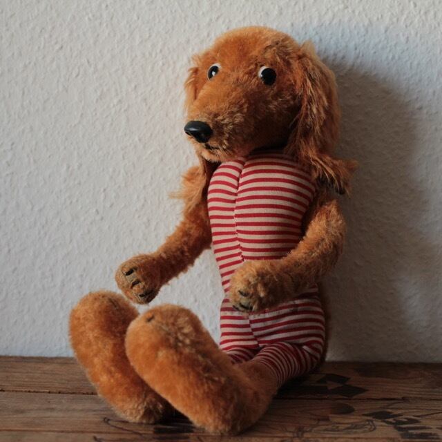 Schucoシュコーの、リアルで可愛い顔のダックス。 グラスアイです。 手や尻尾にモヘアロス。 お腹に汚れがあり、尻尾の付け根に穴が開いています。 サイズ ・体長 約 36cm ・座り時 約 23cm 重さ ・ 約 g ※古いものならではの持ち味をご理解下さった上で、aboutの注意事項をお読みになり、購入をお願いします。