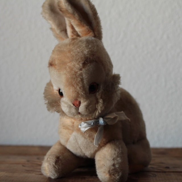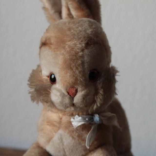 ヴィンテージ又はアンティークのウサギのぬいぐるみです。 グラスアイ。 モヘアパッドには穴があります。 サイズ ・耳を含めた高さ 約 26cm 重さ ・ 約 210g ※古いものならではの持ち味をご理解下さった上で、aboutの注意事項をお読みになり、購入をお願いします。
