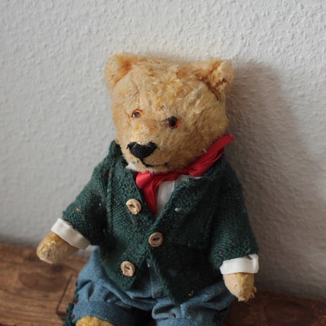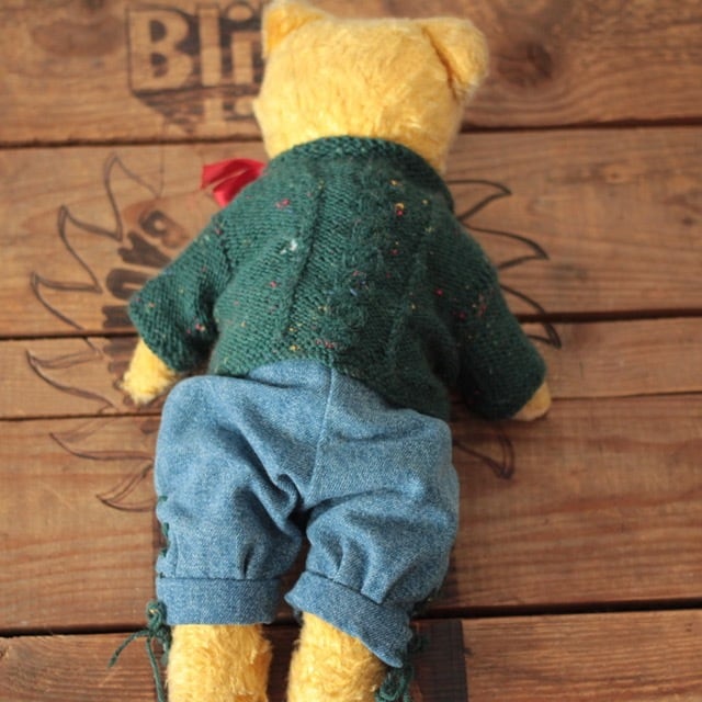 すごく可愛い洋服を着た ヴィンテージ又はアンティークのテディベアです。 グラスアイ 手足はそれぞれ連動して動きます。 顔の色が色褪せていて、鼻の部分の糸が少し切れています。 ニットの背中部分に破れがあります。 サイズ ・体長 約 29cm ・座り時 約 20cm 重さ ・ 約 220g ※古いものならではの持ち味をご理解下さった上で、aboutの注意事項をお読みになり、購入をお願いします。