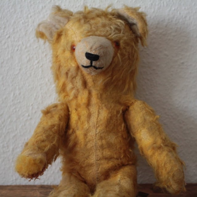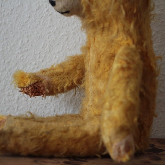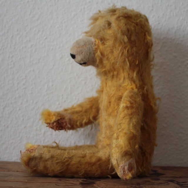 ヴィンテージ又はアンティークのテディベアです。 左腕は壊れてしまったようで縫われています。少し角度が違います。 全体的にモヘアロス。手足のパッドに穴、胸に汚れがあります。 サイズ ・体長 約 39cm ・座り時 約 25cm 重さ ・ 約 g ※古いものならではの持ち味をご理解下さった上で、aboutの注意事項をお読みになり、購入をお願いします。