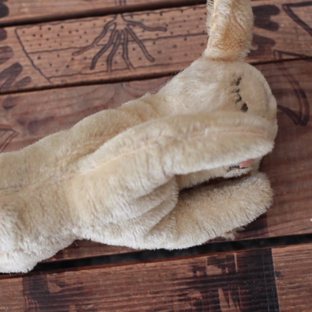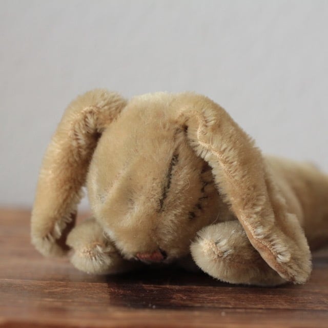54年〜71年にシュタイフ社で作られた 眠りうさぎ Floppy Hansi このショップでも人気です。 銀ボタンのみ残っています。 おでこのあたりに毛のつぶれがあります。 サイズ ・鼻先から足の先まで 約 21cm 重さ ・ 約 70g ※古いものならではの持ち味をご理解下さった上で、aboutの注意事項をお読みになり、購入をお願いします。