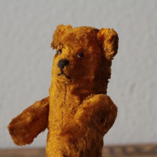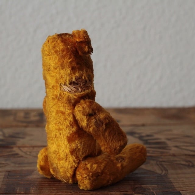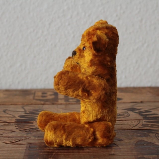 ヴィンテージ又はアンティークのテディベアです。 グラスアイ 手足はそれぞれ連動して動きます。 首と右足に穴があり、木毛が見えています。 サイズ ・体長 約 15cm ・座り時 約 10cm 重さ ・ 約 25g ※古いものならではの持ち味をご理解下さった上で、aboutの注意事項をお読みになり、購入をお願いします。