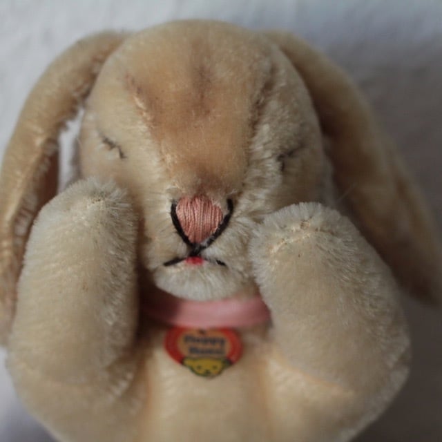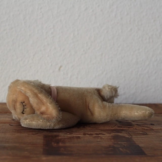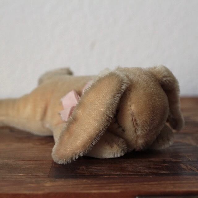 68年〜71年にシュタイフ社で作られたFloppy Hansi 銀のボタン、黄色いタグ、紙タグ(裏に文字が書かれています。) 全て残った、All IDです。 尻尾、首回りの毛に潰れがありますが、 状態は良好です。眠りうさぎは当店でも人気です。 サイズ ・ 約 22cm 重さ ・ 約 85g ※古いものならではの持ち味をご理解下さった上で、aboutの注意事項をお読みになり、購入をお願いします。