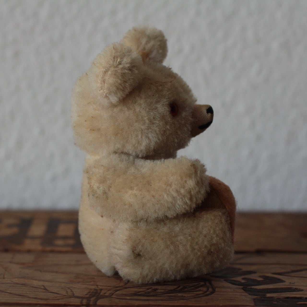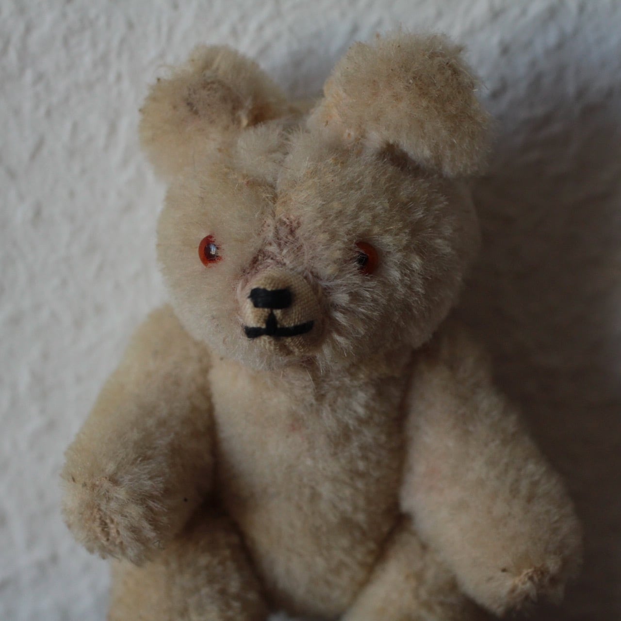 ヴィンテージ又はアンティークのテディベアです。 グラスアイ 手足はそれぞれ連動して動きます。 サイズ ・体長 約 12cm ・座り時 約 9cm 重さ ・ 約 30g ※古いものならではの持ち味をご理解下さった上で、aboutの注意事項をお読みになり、購入をお願いします。