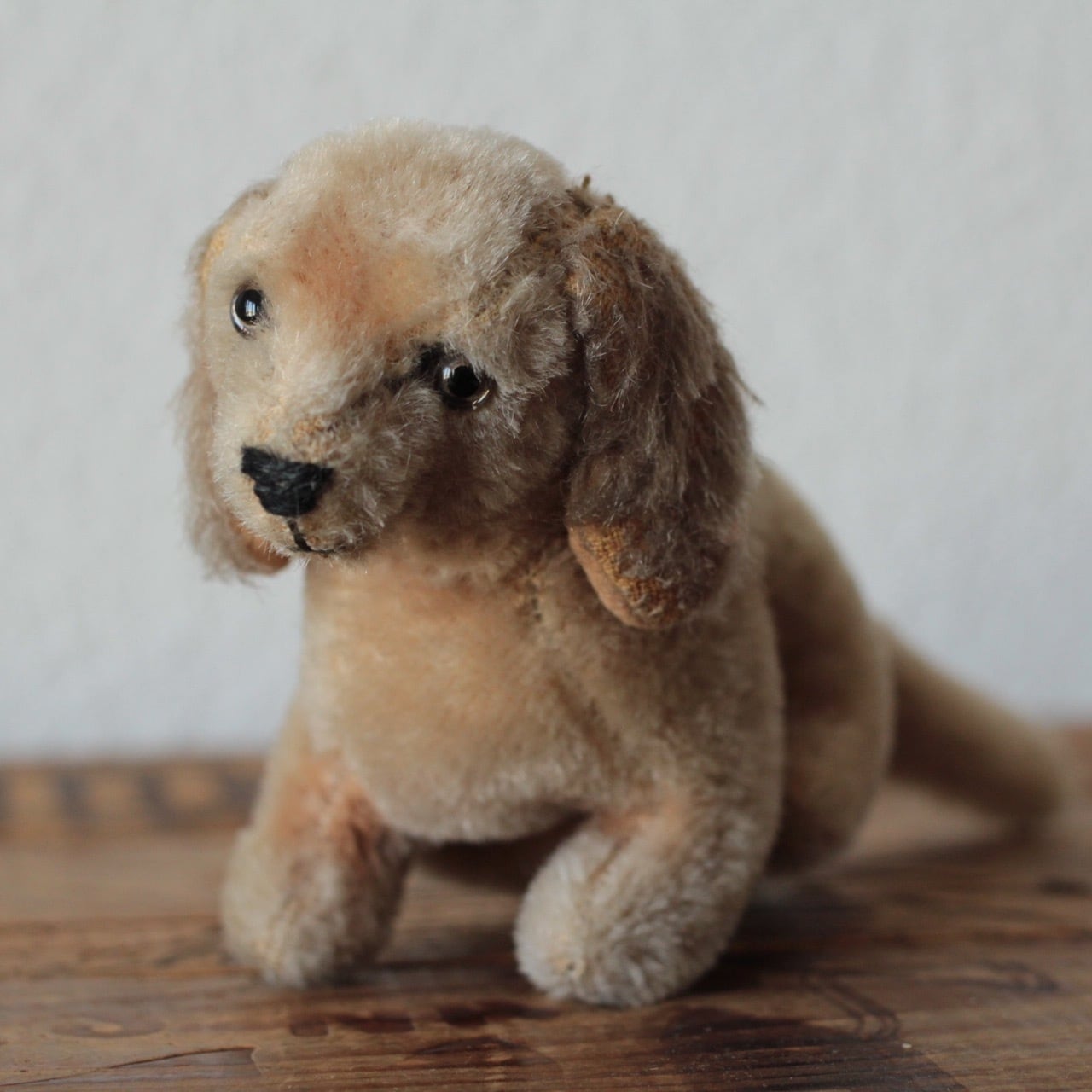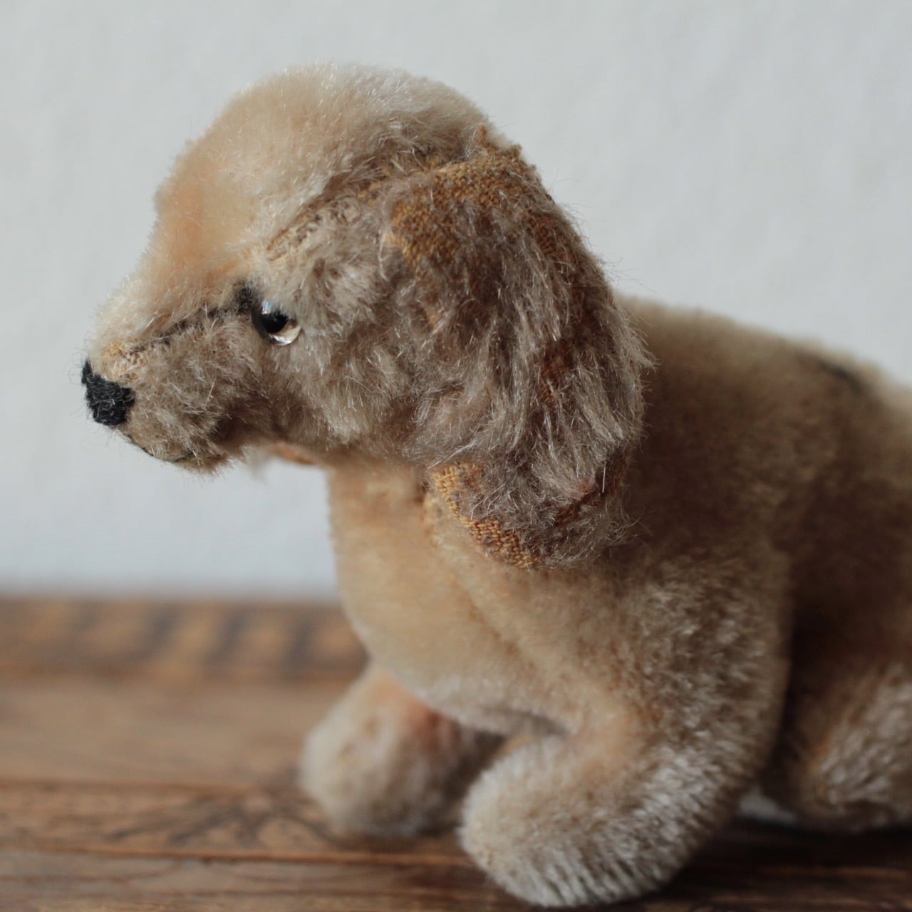 グラスアイの犬です。耳や鼻周りにモヘアロスがあり、 胴体部分に毛の潰れがあります。 ・高さ 約 10cm ・鼻先から尻尾の先まで 約 22cm 重さ ・ 約 55g ※古いものならではの持ち味をご理解下さった上で、aboutの注意事項をお読みになり、購入をお願いします。