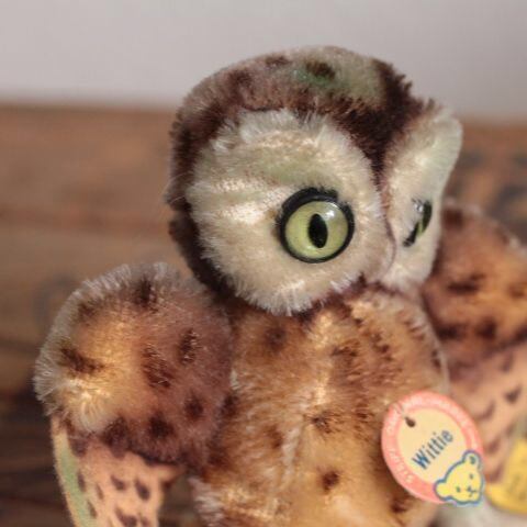 1954年〜58年にシュタイフ社で作られた フクロウUhu/OwlのWittieです。 銀ボタン、黄色のタグ、紙タグ揃っています。 右目の斜め上くらい、背中の一部、お腹にもモヘアロスがあり 目はプラで少し傷があります。 自立できます。 サイズ ・高さ 約 10cm 重さ ・ 約 35g ※古いものならではの持ち味をご理解下さった上で、aboutの注意事項をお読みになり、購入をお願いします。