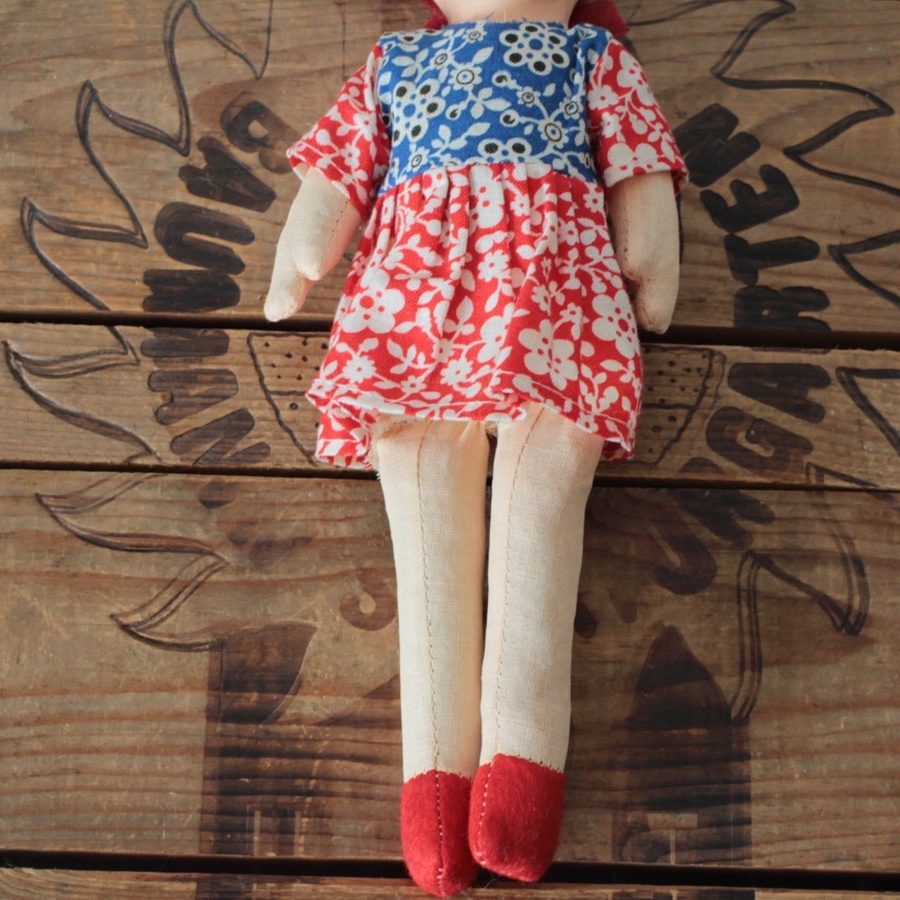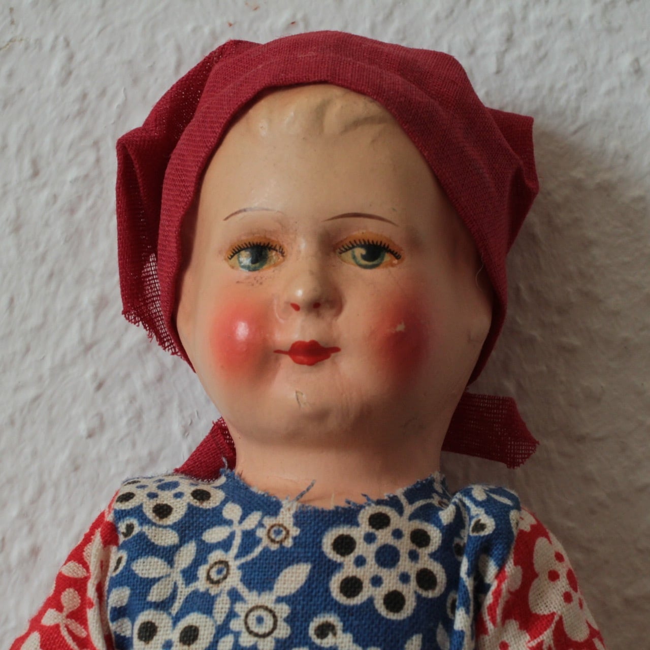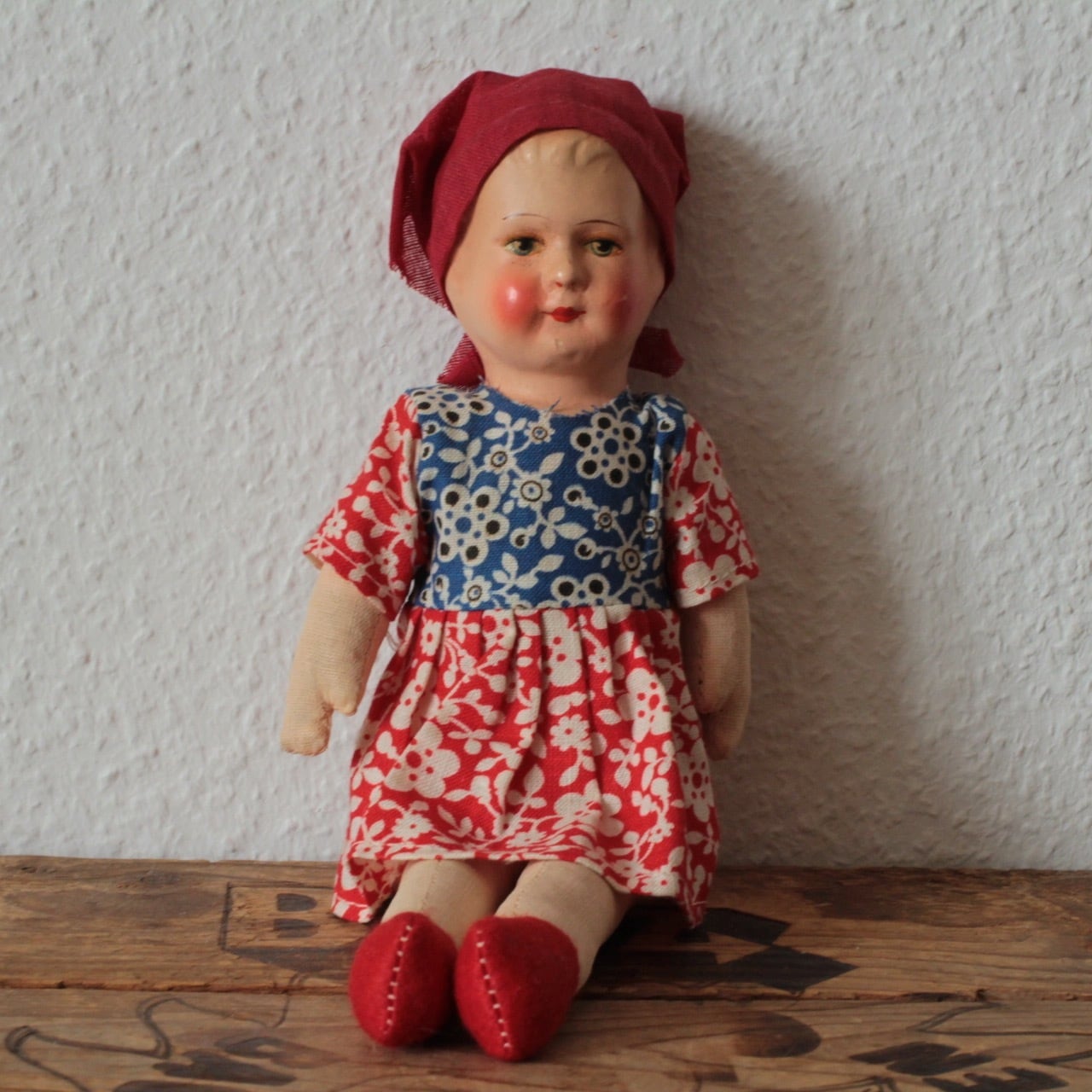 手が少し短い木毛の詰められた人形です。 汚れ、傷があります。 手はジョイントになっているようで少し上下できます。 サイズ ・高さ 約 25cm ・座り時 約 16cm 重さ ・約 50g ※古いものならではの持ち味をご理解下さった上で、aboutの注意事項をお読みになり、購入をお願いします。