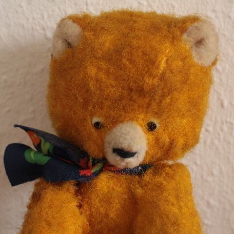 グラスアイのニットを着たDDRベアです。 立っても座っても自立はしません。 首の縫い目がイマイチで、荒く直されていて、 隠す為にスカーフを巻いているようです。 サイズ ・体長 約 25cm ・座り時 約 19cm 重さ ・ 約 212g ※古いものならではの持ち味をご理解下さった上で、aboutの注意事項をお読みになり、購入をお願いします。