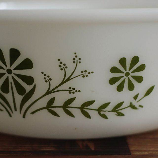 アメリカ製のグラスベイクのデイジー柄 柄が薄れている箇所、ガラス自体に色むらがあります。 サイズ ・蓋なし高さ 約 7.5cm ・蓋あり高さ 約 13cm ・直径 約 21cm 重さ ・約 1350g ※古いものならではの持ち味をご理解下さった上で、aboutの注意事項をお読みになり、購入をお願いします。