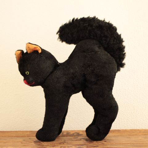 木毛でグラスアイの黒猫です。 首に白い糸での縫い目、耳にも糸がが見え、 耳に汚れがあります。 サイズ ・尻尾までの高さ 約 32cm 重さ ・約 430g ※古いものならではの持ち味をご理解下さった上で、aboutの注意事項をお読みになり、購入をお願いします。