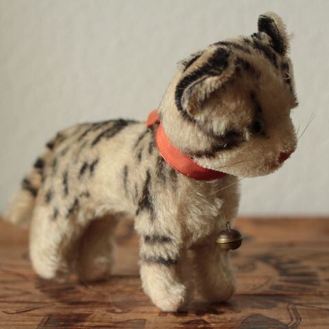 1949年〜77年にシュタイフ社で作られたグラスアイの猫のタビー Tabby オリジナルのリボンと、銀ボタンが残っています。 サイズ ・高さ 約 14cm ・鼻先からおしりまで 約 21cm 重さ ・ 約 75g