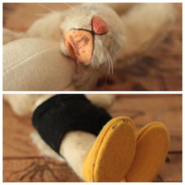 1958年にシュタイフ社で1年間だけ作られたNikili rabbit boy のようです。 グラスアイで黄色のタグ、銀ボタンはなく、 上に着ているはずのベストは着ていません。 靴に小さな穴、口に汚れ、毛の潰れがあります。 サイズ ・耳を含めた体長 約 26cm 重さ ・ 約 105g ※古いものならではの持ち味をご理解下さった上で、aboutの注意事項をお読みになり、購入をお願いします。