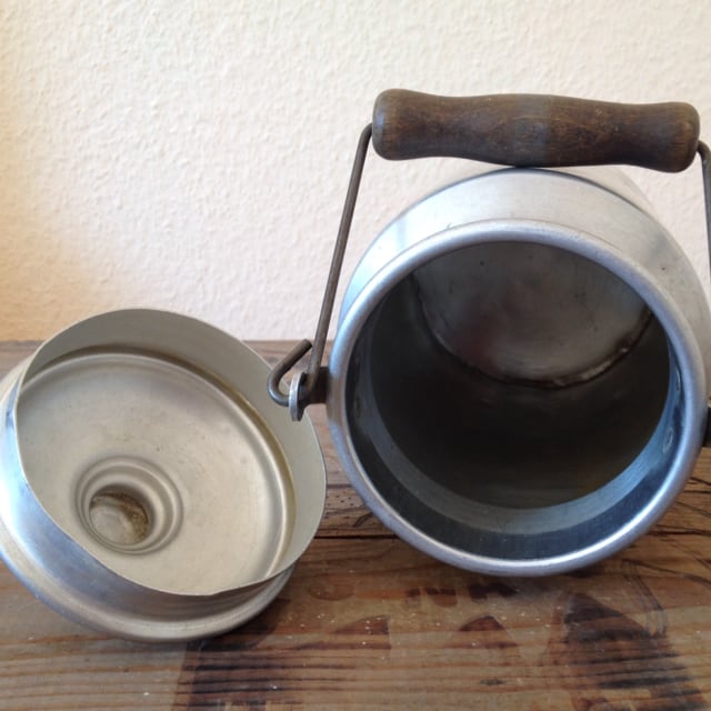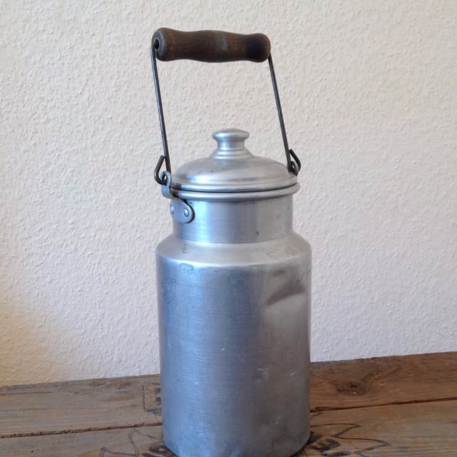 ヴィンテージ アルミ製で、木の取っ手のミルク缶です。