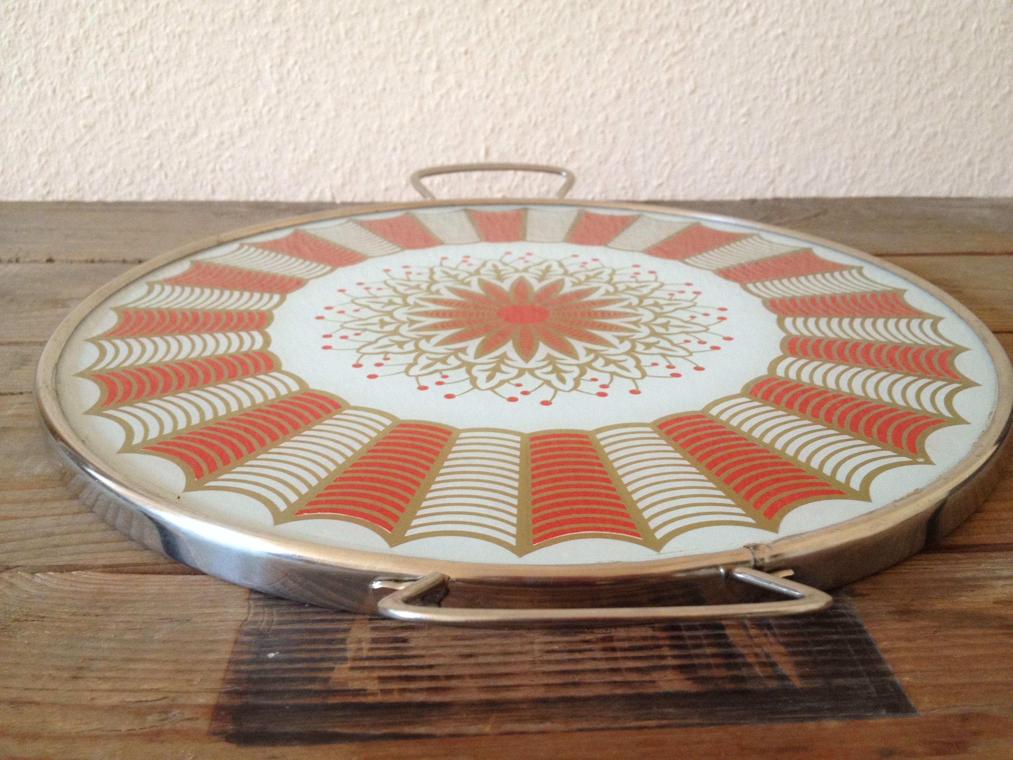 ヴィンテージのレトロなガラスのトレイ/お盆です。 ガラスの裏側からプリントされているようです。 状態 ガラスの状態は良いです。取っ手の辺りにプリントのカケがあります。 裏側は擦り傷が多いです。 サイズ ・直径 約 29センチ ・取っ手から取っ手まで 約 34.5センチ 重さ ・ 約 641g ※古いものならではの持ち味をご理解下さった上で、aboutの注意事項をお読みになり、購入をお願いします。