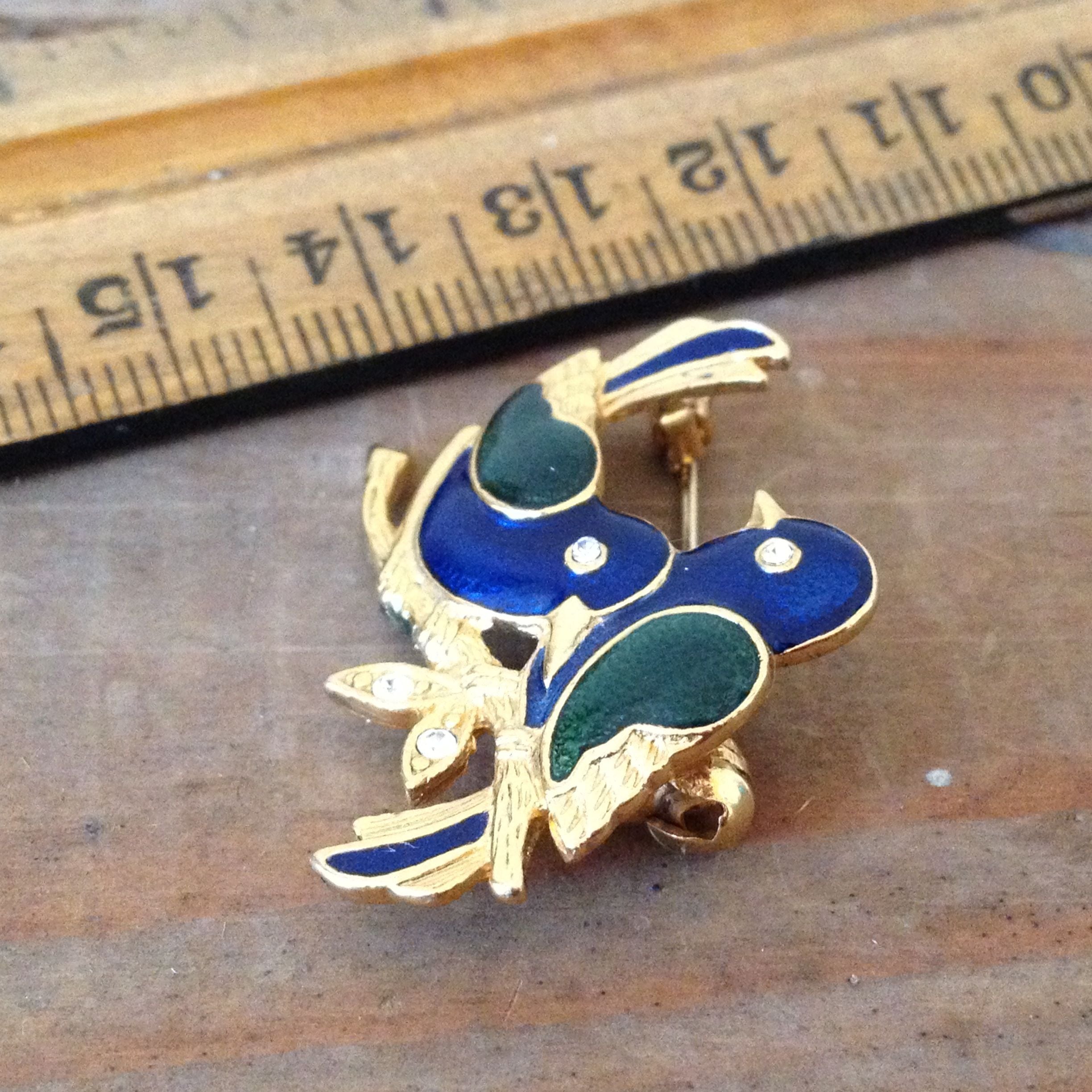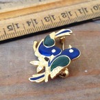 ゴールドに青と緑のカラーの鳥のブローチです。 あまり目立ちませんが、鳥と同じ色が下の枝の部分に付いています。 ラインストーンは4つ全て付いています。 ・約 2.3×3.3 センチ ・ピンの長さ 約2 センチ 重さ ・ 約 6g ※古いものならではの持ち味をご理解下さった上で、aboutの注意事項をお読みになり、購入をお願いします。