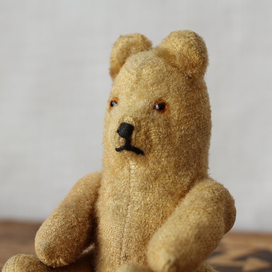 右肩から針金が見えていて変色があります。 全体的なモヘアロス、少し鼻のつぶれがあります。 グラスアイ 手足は連動して動きます。 モヘアロスの具合や体のバランスも可愛いです。 サイズ ・体長 約 12cm ・座り時 約 9cm 重さ ・ 約 25g ※古いものならではの持ち味をご理解下さった上で、aboutの注意事項をお読みになり、購入をお願いします。
