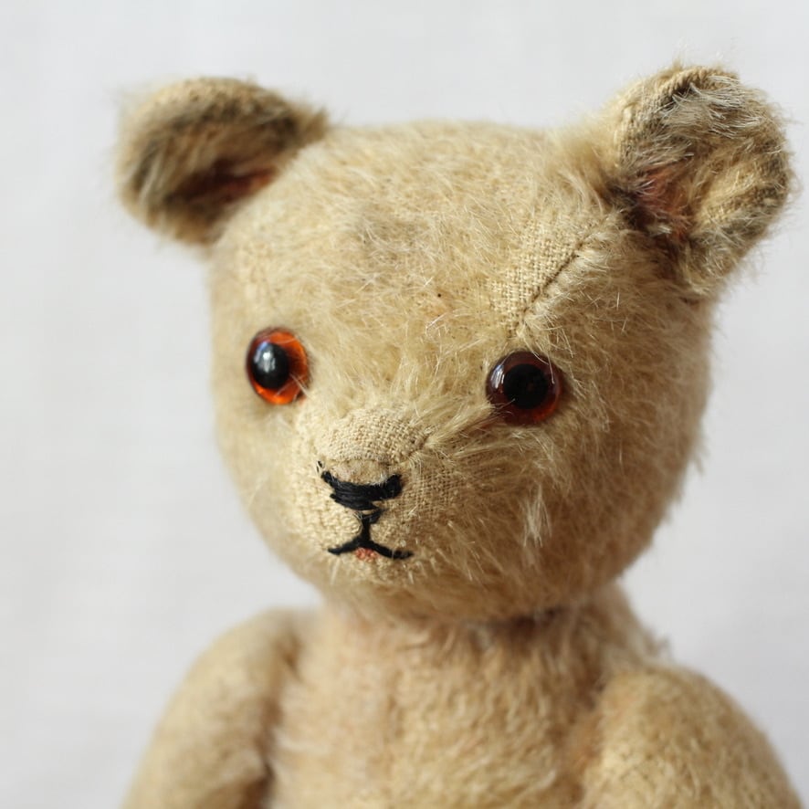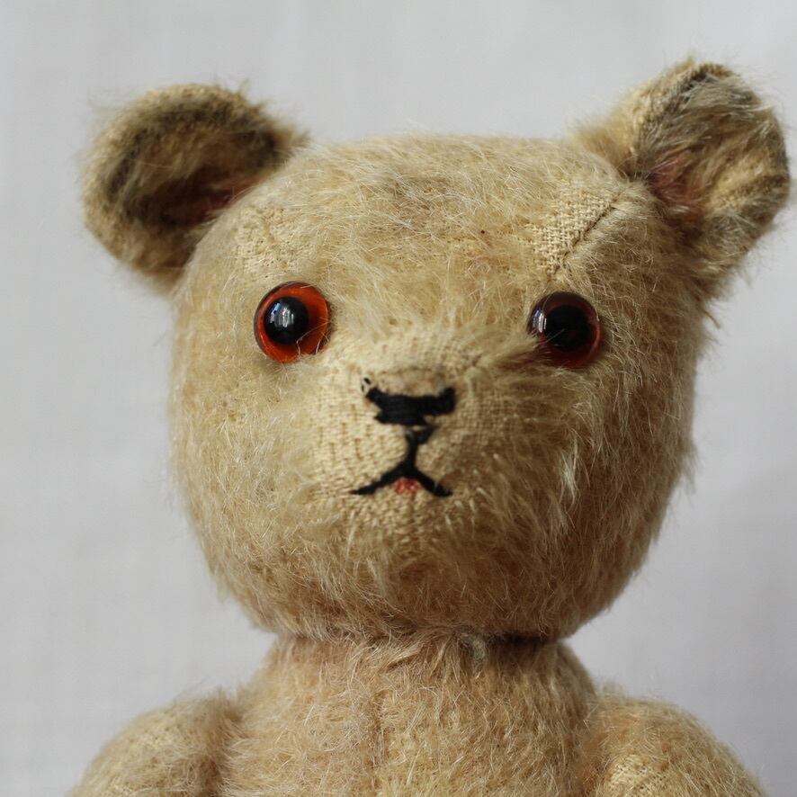 目の大きい可愛いベア 全体的なモヘアロスがあり、左足からは木毛が少し見目ます。 右手に汚れ、足の裏から少し針金が出ています。 グラスアイ 手足は連動せずバラバラに動かせて、なんとか自立させる事もできます。 サイズ ・体長 約 22cm ・座り時 約 17cm 重さ ・ 約 125g ※古いものならではの持ち味をご理解下さった上で、aboutの注意事項をお読みになり、購入をお願いします。