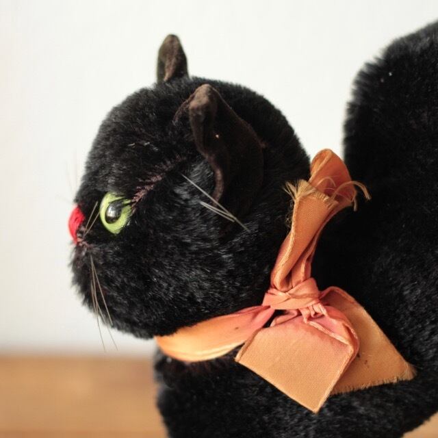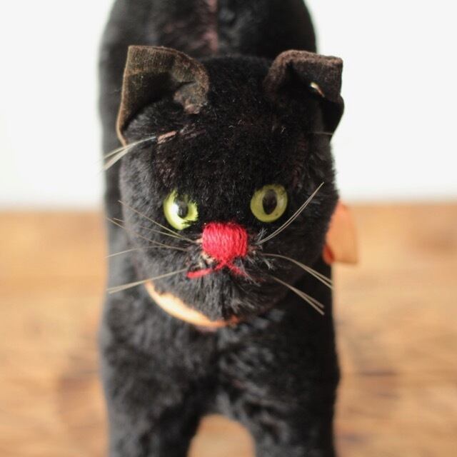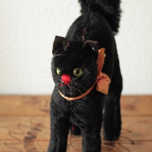 1950年〜74年にシュタイフ社で作られた 黒猫 トムキャット Black Tom Cat 22cm 銀ボタンと、オリジナルのリボンが残っています。 サイズ ・頭の高さ 約 21cm ・尻尾の高さ 約 32cm ・鼻先からお尻まで 約 18cm 重さ ・ 約 200g ※古いものならではの持ち味をご理解下さった上で、aboutの注意事項をお読みになり、購入をお願いします。