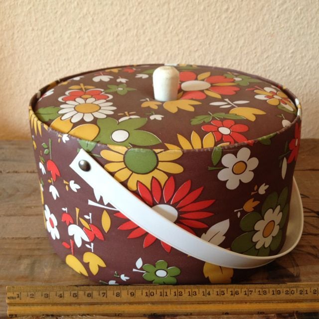 厚紙とビニールで出来ているようなソーイングボックスです。ふちに擦れが見られ、取っ手に汚れがありますが、 全体的には良いコンディションだと思います。 サイズ ・高さ 約 12センチ(取っ手を含めず) ・直径 約 23センチ ・持ち手の長さ 約 45センチ 重さ ・ 約 535g ※古いものならではの持ち味をご理解下さった上で、aboutの注意事項をお読みになり、購入をお願いします。