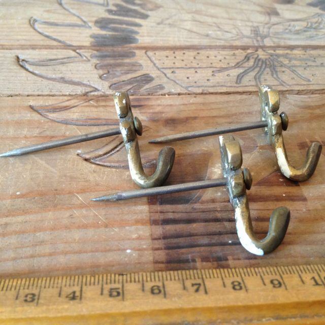 ユリの紋章モチーフのフックの3つセット 素材は真鍮だと思います。釘部分は外れません。 ペンキが付いていて、釘部分に錆があります。ペンキは擦ると多少取れます。 何かの溶液でも取れるかもしれません。 サイズ 約 4センチ 釘部分 約 4.3センチ 合計の重さ ・ 約 40g