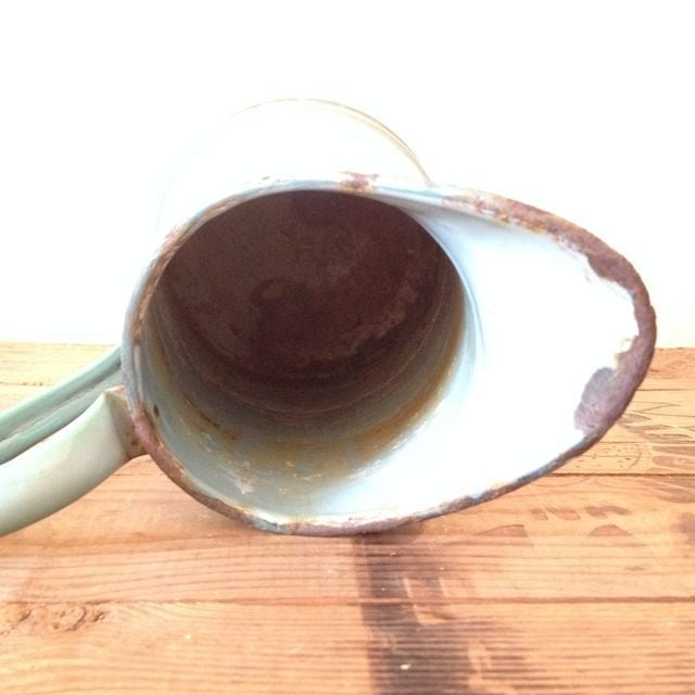 底の錆が酷いので、ドライフラワーなど飾っても綺麗ですね。 花瓶にする場合は瓶やペットボトルなどを中に入れた方がいいかと思います。 サイズ ・高さ 約 24センチ ・直径 約 13.3センチ ・幅 約 20センチ 重さ ・ 約 g ※古いものならではの持ち味をご理解下さった上で、aboutの注意事項をお読みになり、購入をお願いします。