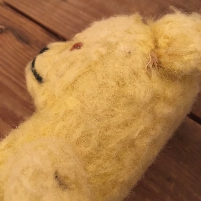 ヴィンテージ又はアンティークのテディベアです。 手足はそれぞれ連動して動きます。 肩からは針金が見えています。 全体的な毛の潰れ、鼻周りにモヘアロス 左耳の付け根からは木毛が見えます。 サイズ ・体長 約 24cm ・座り時 約 16cm 重さ ・ 約 100g ※古いものならではの持ち味をご理解下さった上で、aboutの注意事項をお読みになり、購入をお願いします。