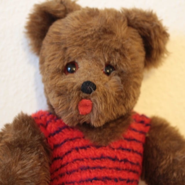 ヴィンテージ又はアンティークのテディベアです。 大きめのグラスアイ。手足に薄いシミがあります。 中は綿で柔らかく、ジョイントはありませんが、針金が入っていてポーズが変えられます。 サイズ ・体長 約 40cm ・座り時 約 30cm 重さ ・ 約 230g ※古いものならではの持ち味をご理解下さった上で、aboutの注意事項をお読みになり、購入をお願いします。