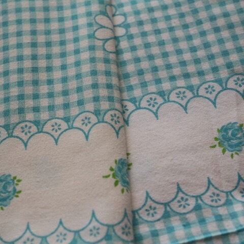 [B124]ドイツ ヴィンテージファブリック 60×50cm 水色のギンガムチェックにレース