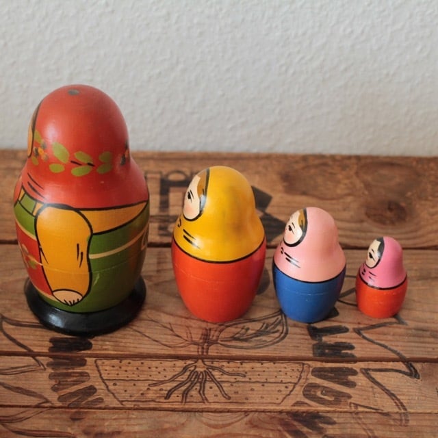 マトリョーシカ made in USSR(旧ソ連) 傷汚れあります。 サイズ ・大きい子高さ 約 13cm ・小さい子 高さ 約 4.5cm 重さ ・約 115g ※古いものならではの持ち味をご理解下さった上で、aboutの注意事項をお読みになり、購入をお願いします。